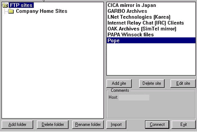 Al ejecutar el CuteFTP primeramente aparece una pantalla como la siguiente: Esta ventana agrupa el conjunto de direcciones que se tienen activadas, aqui usted puede llevar el control de las direcciones FTP que usted tenga. A la izquierda tenemos las carpetas que contienen las direcciones FTP que se hayan configurado y a la derecha direcciones FTP de algunas empresas de software, usted puede quitar de ahí las que guste. En la parte baja de la ventana tenemos los botones de comando "Add Folder", "Delete Folder", "Rename Folder" que nos permiten agregar, eliminar ó renombrar una carpeta ya existente. Cuando se selecciona una carpeta de las que se ubican en la parte izquierda de la ventana, se despliegan las direcciones que ésta contiene, y si se selecciona una direccion se activan los botones, "Add Site", "Delete Site", "Edit Site". Si la dirección a la que se desea accesar existe se le da un click a el boton "Connect", sino, se puede agregar una dirección dando un click en el boton "Add Site". Posteriormente se desplegará la siguiente Ventana: En el campo "Site Label" se teclea el nombre de la dirección FTP que se va a configurar. En el campo "Host Address" se teclea el nombre del servidor que nos da acceso. En los campos "User ID" y "Password" se teclean el nombre del usuario y su password respectivamente. Posteriormente en el campo "Initial Remote Directory", usted puede teclear el directorio remoto al cual desea accesar. Después de que se configuró una nueva dirección o se eligió una de la lista izquierda de la primer ventana, y se le dió click al botón "Connect" aparece una ventana como la siguiente: Esta es la pantalla principal del CuteFTP, en la parte superior se puede observar como el sistema envía mensajes de que la conexión se está llevando a cabo. En la parte inferior izquierda aparece lo que biene siendo la unidad de disco duro local que desplegará como directorio el actual del CuteFTP.A la derecha aparece un espacio en el cual se despliegan los directorios y archivos del Servidor al cual se está conectado. La transmición de datos entre el servidor y el host local se puede llevar acabo simplemente arrastrando de un lado al otro las carpetas que se desee enviar o recibir, es un procedimiento parecido al de el "Explorador de Windows" en el que para copiar una carpeta de un lugar a otro simplemente se le arastra hasta la posición deseada. Si el directorio al cual se acceso no contiene ningun archivo se le puede dar un click a el icono con la pequeña flecha que aparece en la ventana, para de esta manera subir posiciones en el árbol de directorios. |